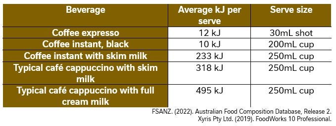 FACT – Coffee prepared on water is actually a low kilojoule beverage. A plain black coffee contains only five calories (10 kJ) per cup. Add the goodness of your favourite milk to coffee to boost your calcium intake (choose dairy or plant-based milk fortified with calcium).
