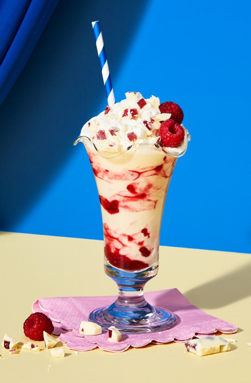 - Place a spoonful of raspberry coulis in the base of the glass, pour in milkshake mix and top with cream and pieces of MILKYBAR® Block.